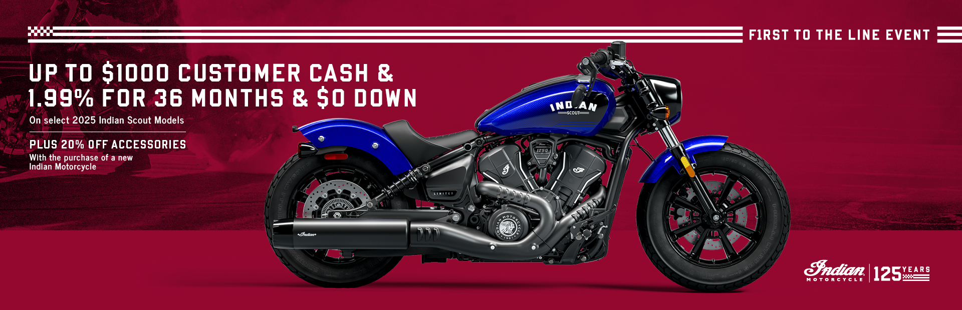 This is a limited time offer which consists of $500 Customer Cash rebate towards the purchase of new model year 2025 Scout Bobber, Super Scout, 101 Scout, or Scout Sixty Bobber Limited. This offer is subject to change and may be extended or terminated without further notice. Offer may be combined with promotional financing offers. All rebates paid to dealer and are not redeemable for cash. Offer Valid: April 1 – 30, 2026.
